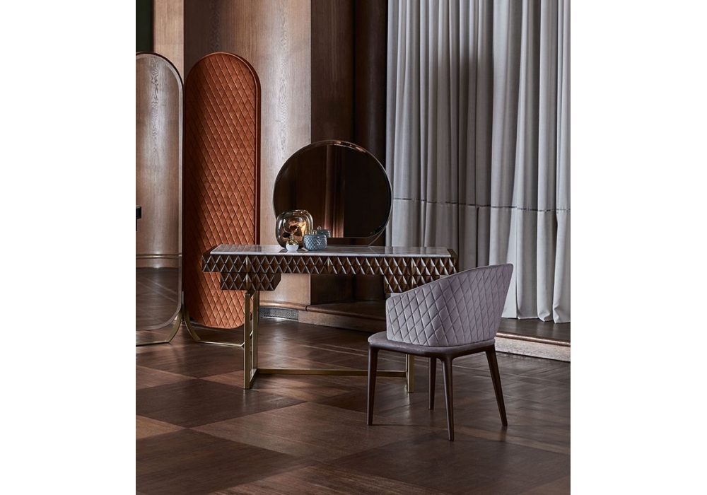 Victor disegnata da Castello Lagravinese Studio for Opera Contemporary è una toeletta con piano in marmo, 5 cassetti, base in metallo e specchio circolare.