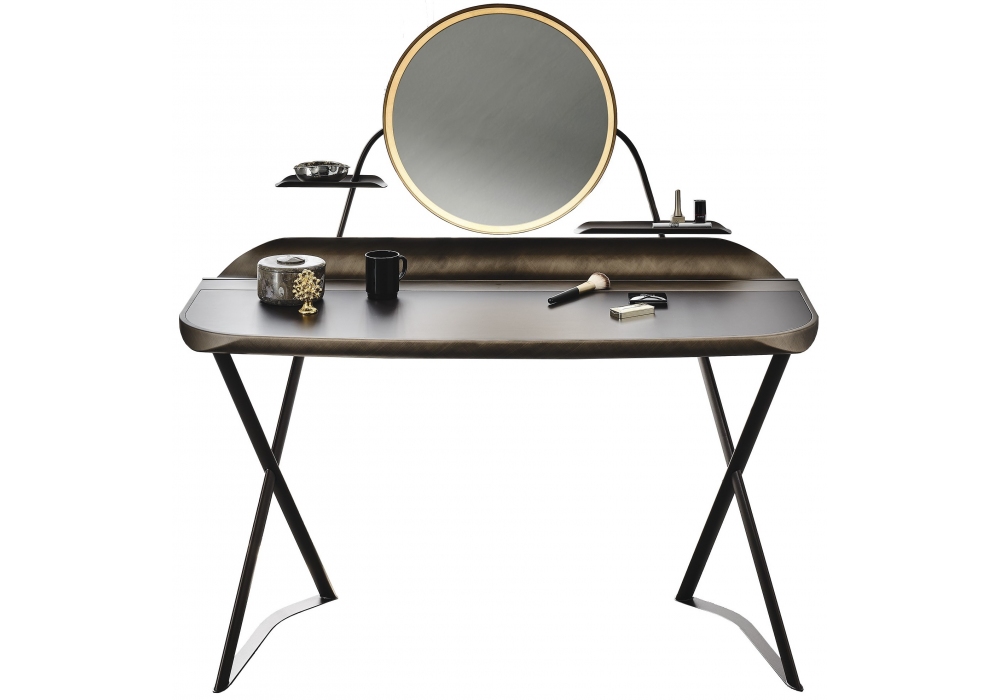 Cocoon Trousse Leather firmata da Paolo Cattelan per Cattelan Italia è un console da trucco realizzata con base in acciaio verniciato. Piano in cuoio in diversi colori con profilo inferiore arrotondato e verniciato Brushed Bronze o Brushed Grey e gola portaoggetti in metallo verniciato Brushed Bronze o Brushed Grey. Specchiera in acciaio verniciato con supporti laterali e ripiani in acciaio verniciato. Illuminazione a led.
