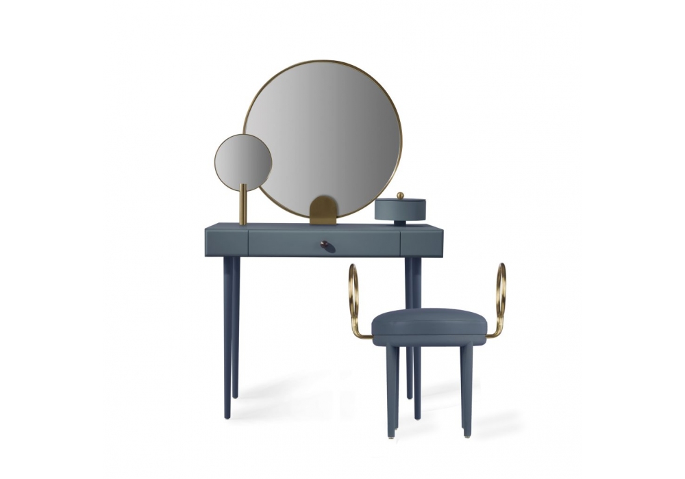 Rose Selavy firmata da Thomas Dariel per Maison Dada è una toeletta con top di forma quadrangolare strutturata in MDF con impiallacciato di frassino verniciato in differenti finiture. Gambe in metallo impiallacciato di frassino verniciate in diverse colorazioni. Tutte le parti metalliche sono placate champagne lucido. Rose Selavy è disponibile con o senza sgabello.