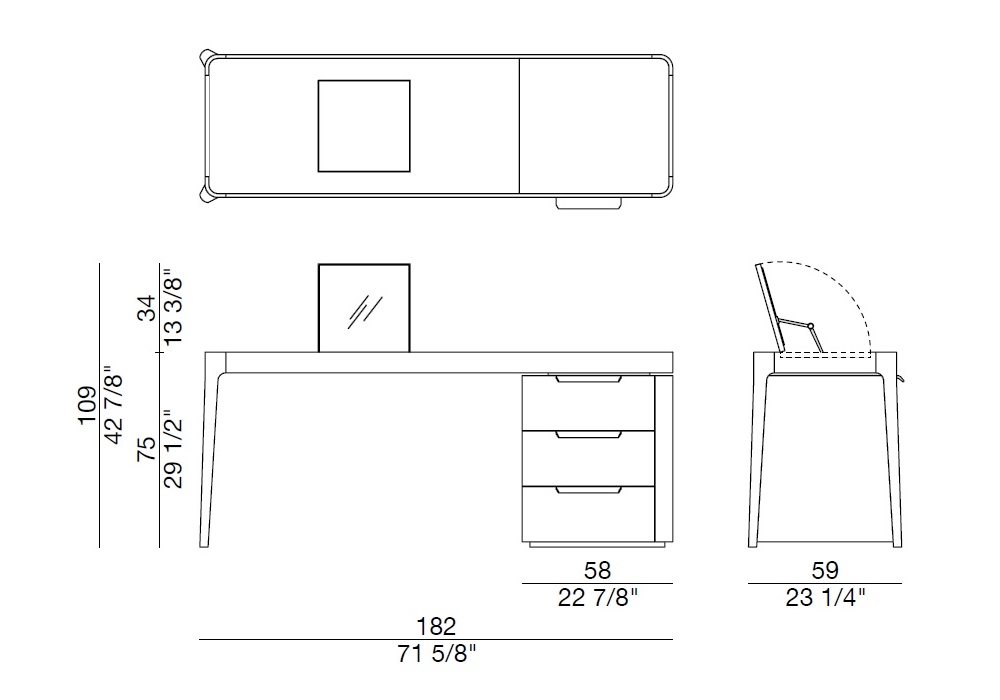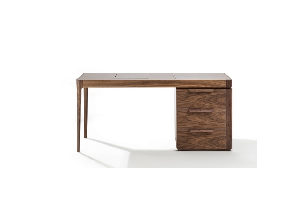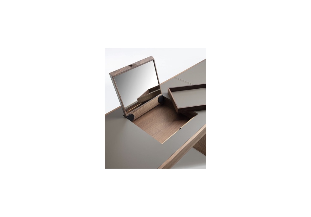 Afrodite Bijoux firmata da Carlo Ballabio per Porada è una coiffeuse con struttura in massello di noce Canaletta, elemento laterale con tre cassetti e vano porta oggetti a scomparsa con specchio integrato. Piano realizzabile unicamente in Cuoietto.