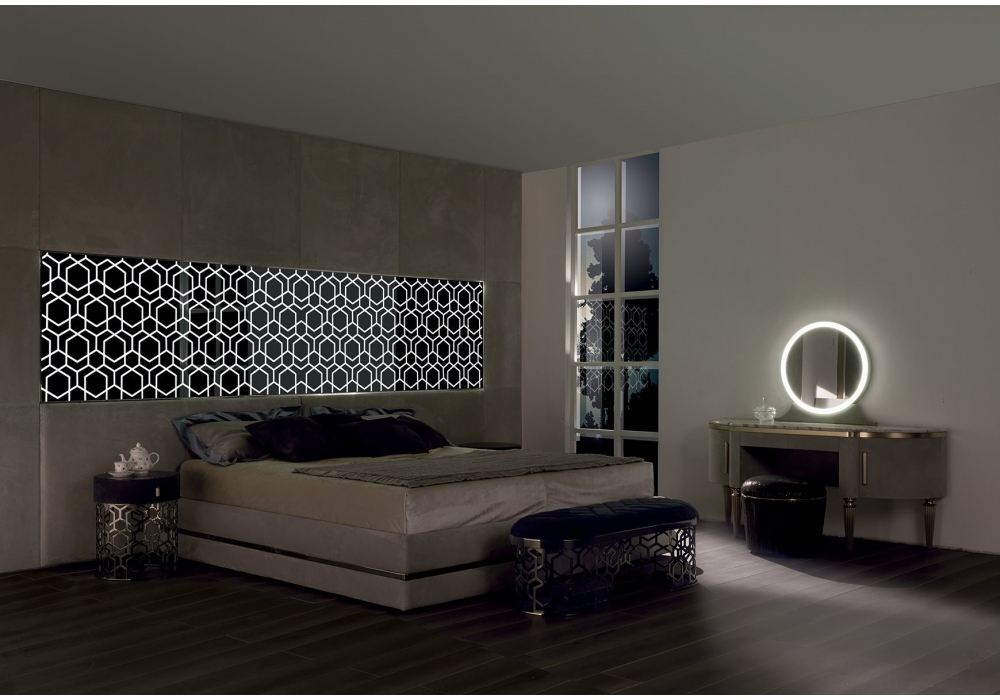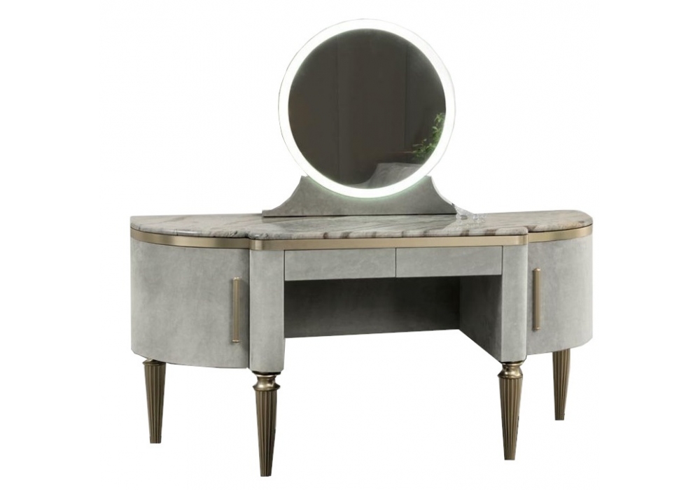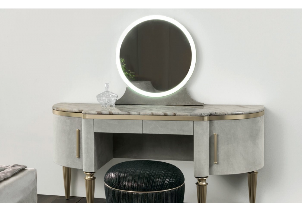 Dame firmato da Giuseppe Iasparra per Longhi è un tavolo make-up in legno rivestito in pelle con due cassettini e due ante curve laterali. Base e maniglie in metallo scanalato e piano sagomato in marmo. Specchio tondo con la base rivestita in pelle come il mobile, bordo in metallo, fascia luminosa sul perimetro dello specchio con luce a led dimmerabile.