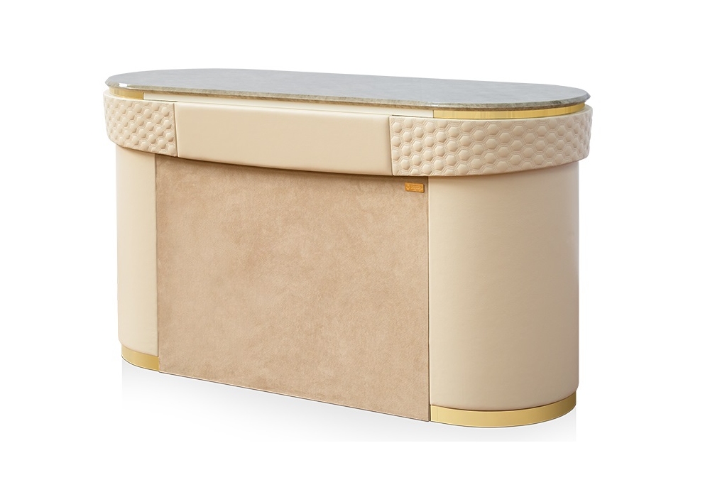 Vogue firmata da Andrea Bonini per Turri è una toeletta con struttura in MDF, multistrato e pannelli di particelle di legno in finitura lucida e rivestimento in pelle. Il piano è realizzato in legno o marmo. Sono presenti tre cassetti con rivestimento esterno in pelle con motivo esagonale. Base e dettagli in metallo dorato.