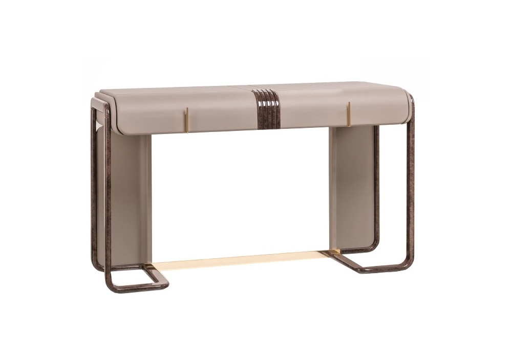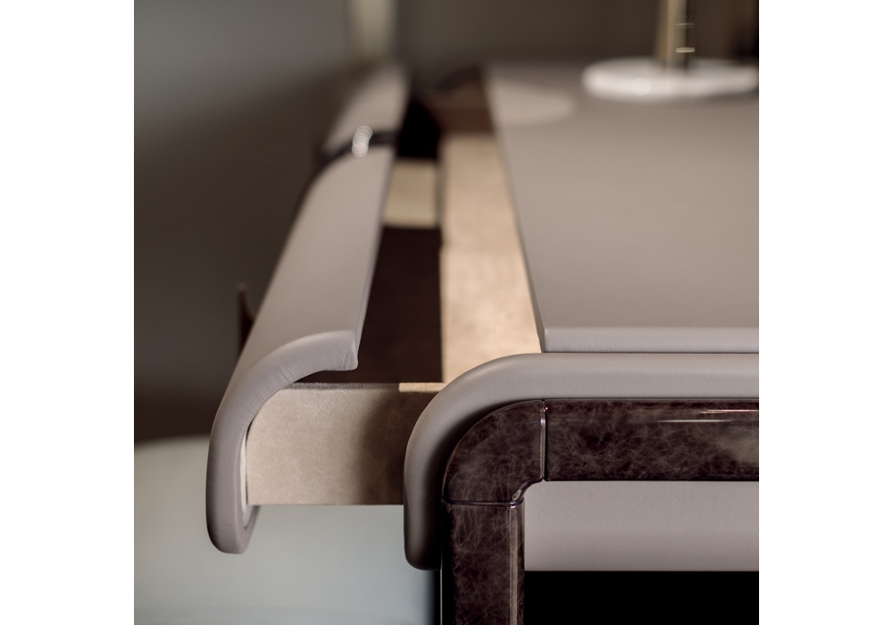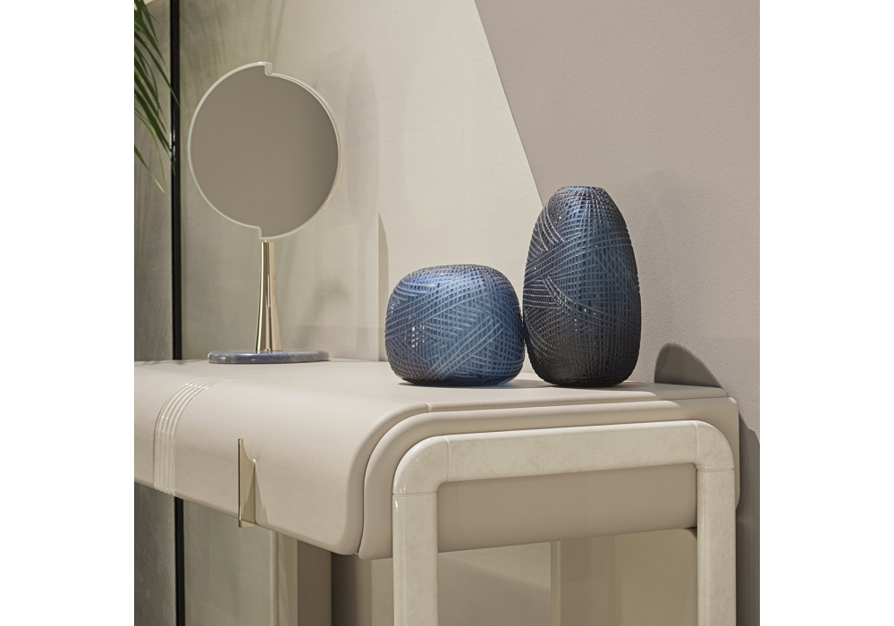 Eclipse firmata da Andrea Bonini per Turri è una toeletta con struttura in MDF, multistrato e pannelli di particelle di legno in finitura laccata lucida e rivestimento in pelle. Dettagli in metallo dorato. Disponibile nella versione con o senza specchio.