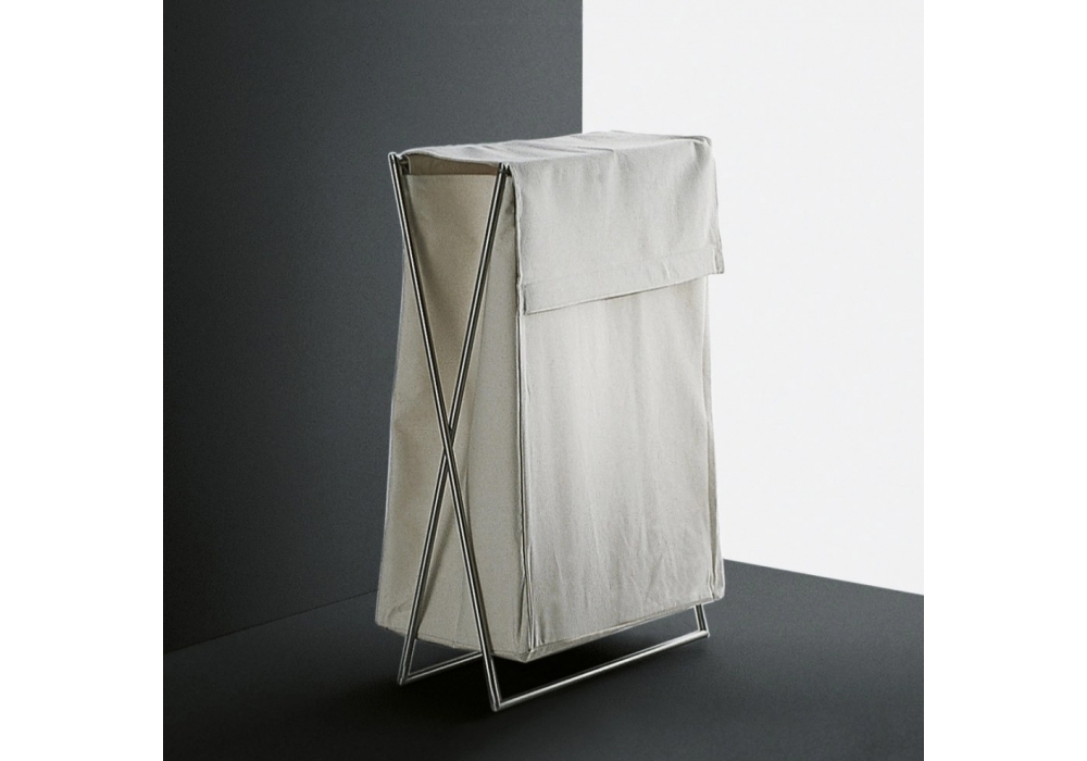 Minimal firmata da Giulio Gianturco per Boffi è una sacca porta biancheria in tessuto con struttura portante in acciaio inox AISI 304 nella finitura satinata.