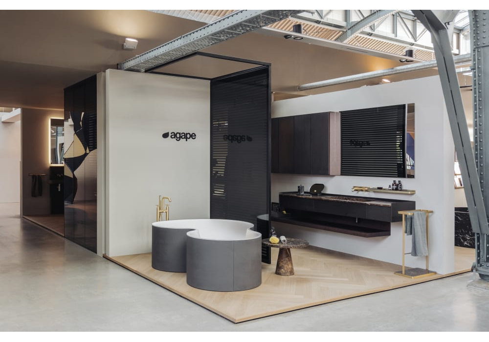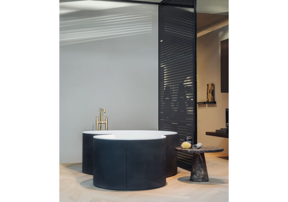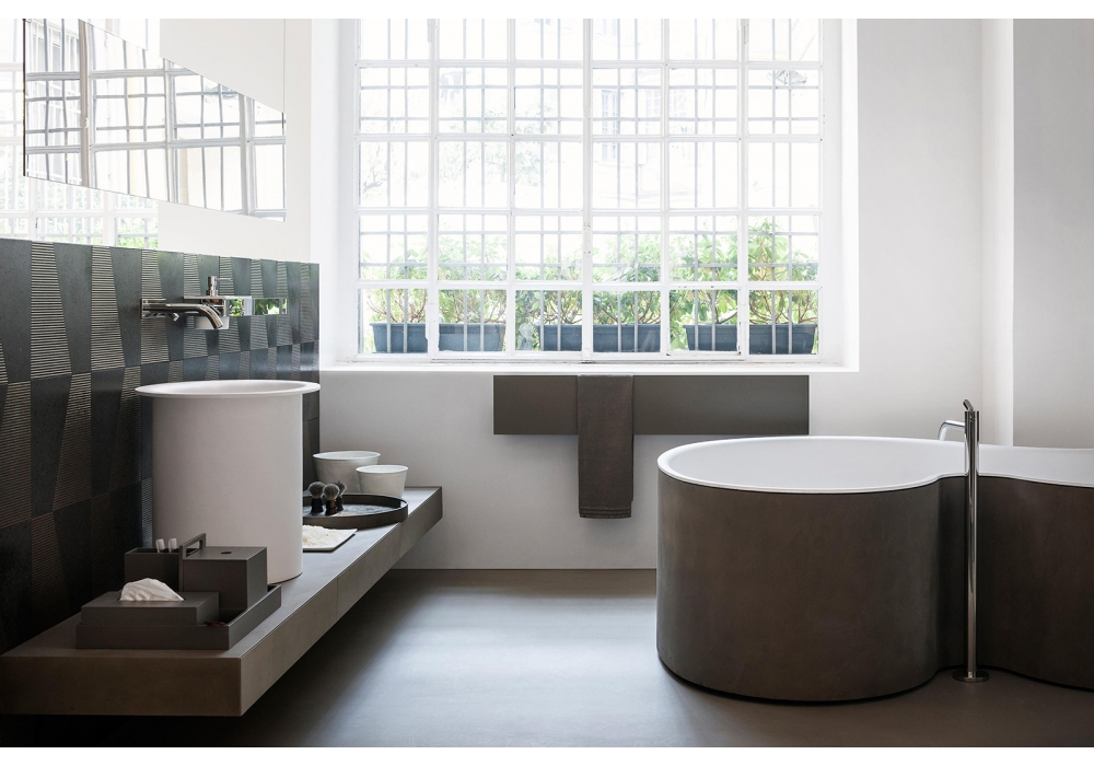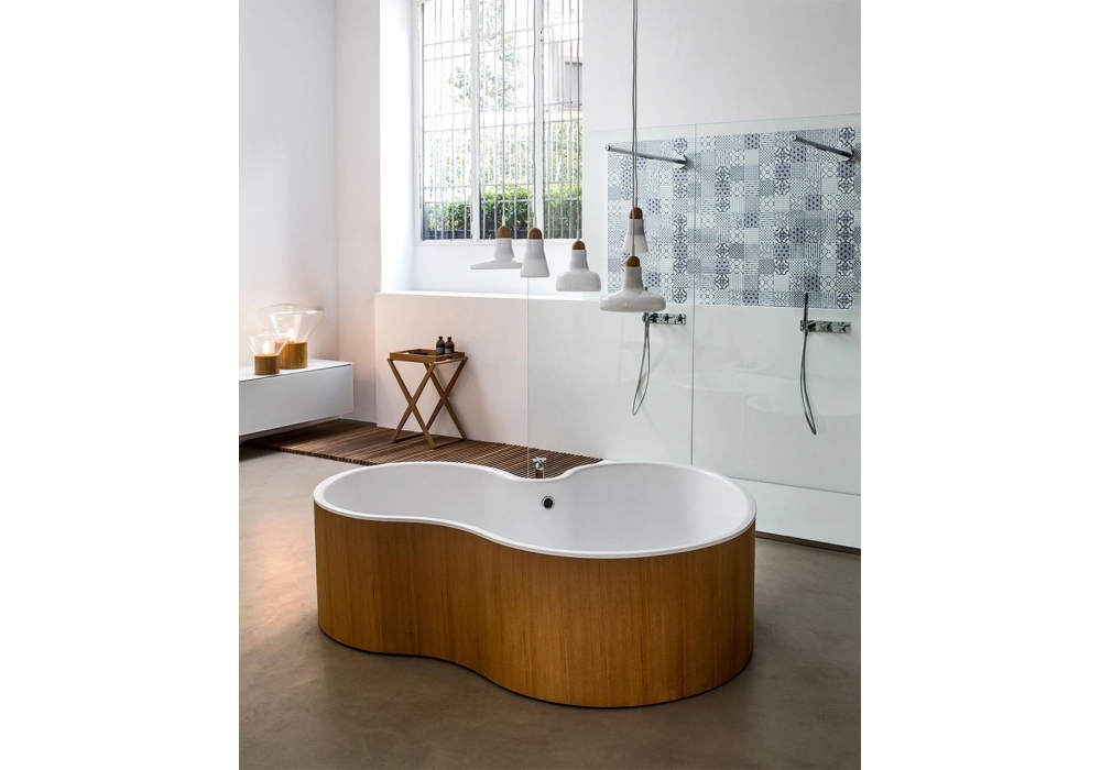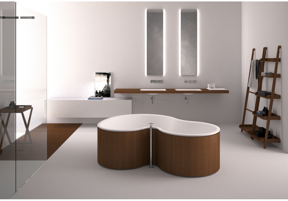 DR firmata da Studio MK27, Mariana Ruzante e Marcio Kogan per Agape è una vasca da bagno in solid surface bianco con struttura in multistratp di pioppo, in legno precomposto con finitura teak, laccata soft touch o in terra cruda, senza fori per rubinetteria. L’erogazione dell’acqua è possibile anche dall’interno della vasca tramite foro provvisto di ghiera in acciaio inox lucido.