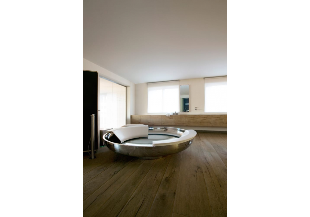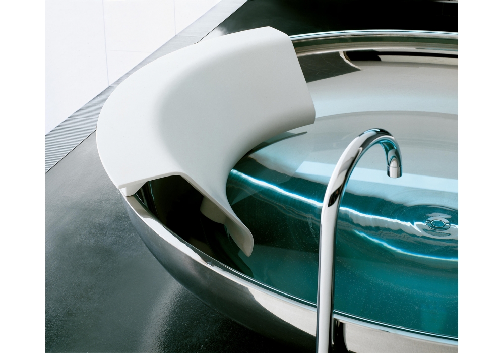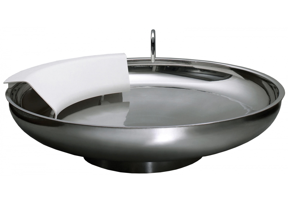Ufo firmata da Benedini Associati per Agape è una vasca da bagno circolare in acciaio inox lucido o in acciaio verniciato in bianco con esterno grigio scuro e poggiaschiena in Cristalplant® biobased bianco. É dotata di foro per troppo pieno. Non sono previsti fori per la rubinetteria; questa può essere collocata a parete o a terra. È obbligatorio l’utilizzo della piletta sifonata.