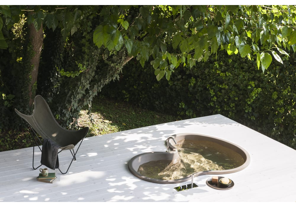 DR Cemento Outdoor firmata da Studio MK27, Mariana Ruzante e Marcio Kogan per Agape è una vasca da bagno realizzata in Cementoskin® disponibile in differenti finiture. Disponibile nella versione freestanding con pannelli di finitura esterni in multistrati di okumè fenolico con rivestimento in resina cementizia nello stesso colore della vasca oppure senza pannelli esterni per la versione da incasso. Troppo pieno integrato nella piletta cromata inclusi. Non sono previsti fori per la rubinetteria.