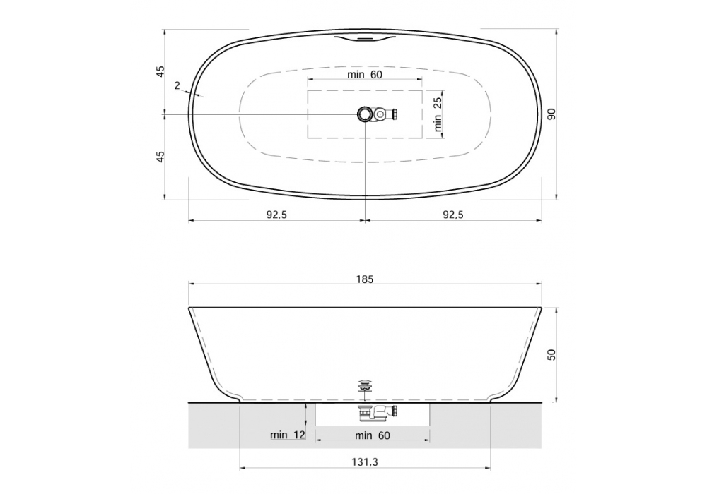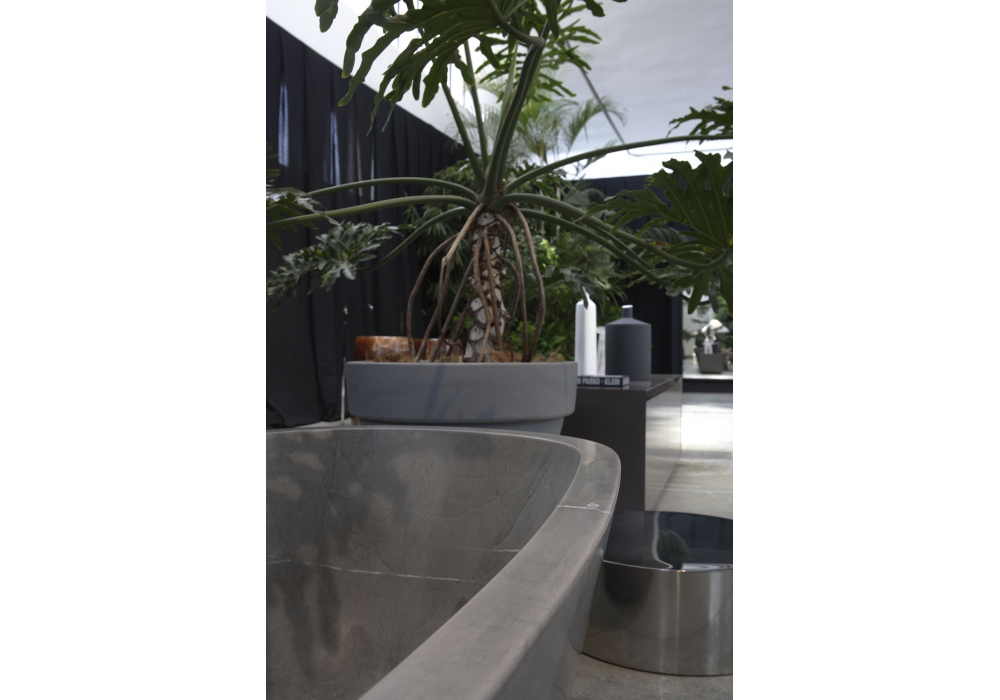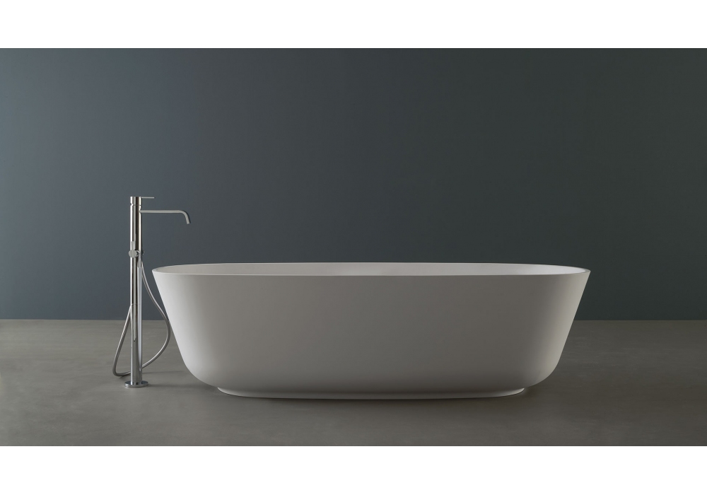 Baìa firmata da Carlo Colombo per Antonio Lupi è una vasca da bagno ovale in Cristalplant oppure in pietra, verniciabile esternamente, completa di piletta con sistema di scarico a pressione clik clak, sifone e tubo flessibile.