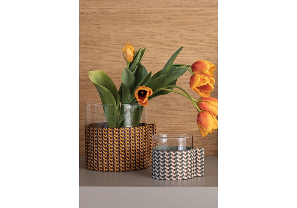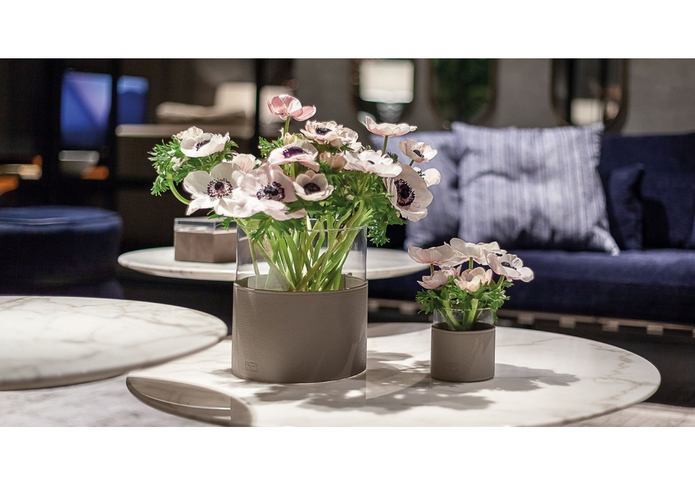 Leather Pot disegnato da Simona Cremascoli per Poltrona Frau è un vaso realizzato in vetro con rivestimento in Pelle Frau Nest o SC. Disponibile in tre dimensioni.