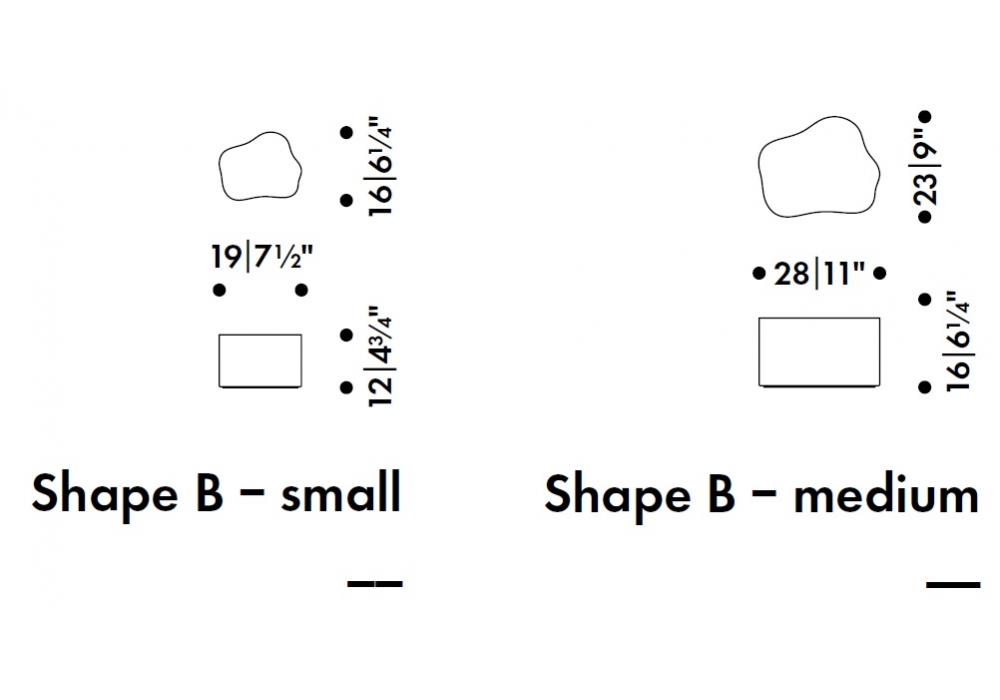 | Dimensioni | Shape A, Small_ 20.5 x 16 x H 12 cm; Shape A, Large_ 40 x 27 x H 20 cm; Shape B, Small_ 19 x 16 x H 12 cm; Shape B, Medium_ 28 x 23 x H 16 cm; |