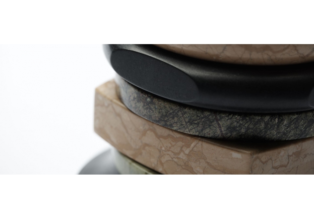 Lollo firmato da Cristina Celestino per Budri è un vaso composto da bangles di differenti colori e forme, realizzato in Nero Assoluto, Verde Ming, Rain Forest Green, Giallo Noce and Onice Miele.