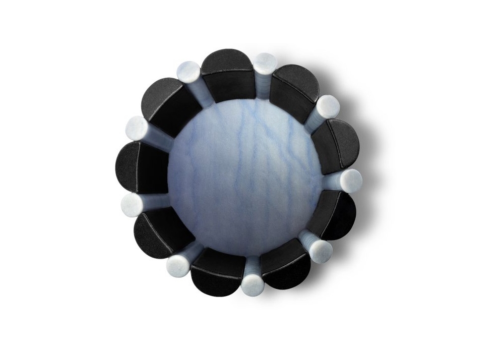 Gae firmato da Cristina Celestino per Budri è un vaso cilindrico composto da "cannucce" in marmo Azul Macaubas e Nero Assoluto. Il fondo del vaso è in Azul Macaubas.