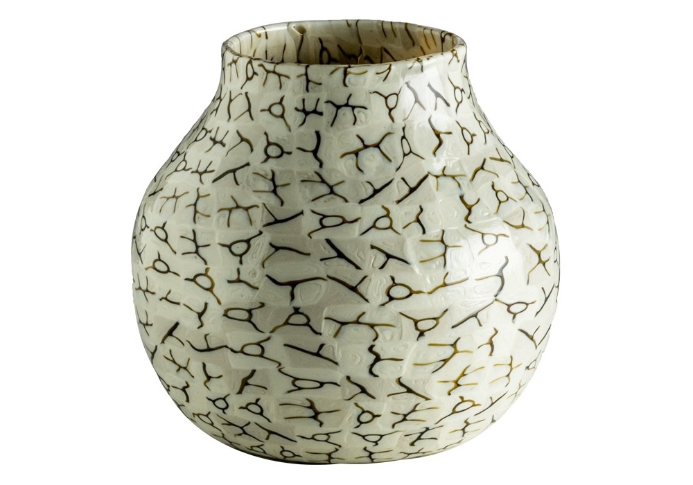 Coccio firmato e prodotto da Venini è un vaso in vetro soffiato e decorato con la tecnica delle murrine, in colore avorio/tè.