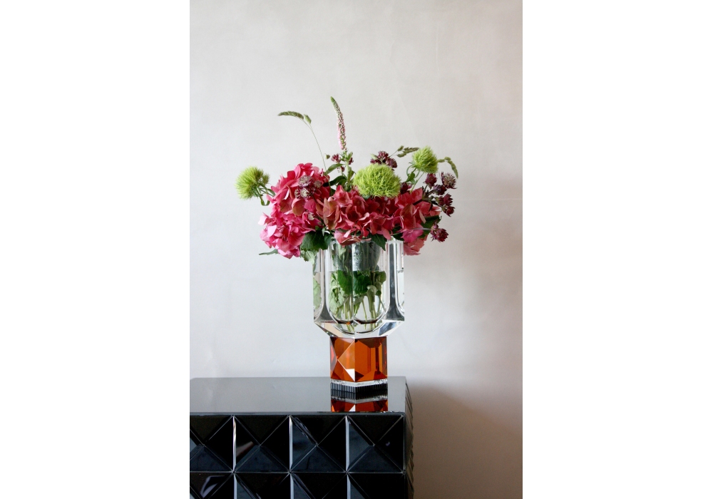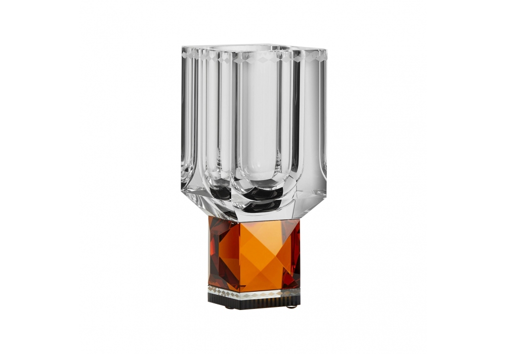 Ohio prodotto e firmato da Reflections Copenhagen è un vaso in cristallo di forma quadrangolare strutturato da vari elementi intagliati e rifiniti a mano di colore trasparente, ambra e nero.