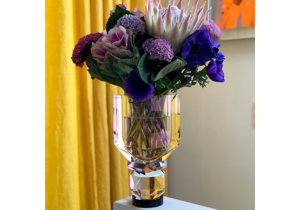 Utah prodotto e firmato da Reflections Copenhagen è un vaso in cristallo di forma quadrangolare strutturato da vari elementi intagliati e rifiniti a mano di colore trasparente, rosa e nero.