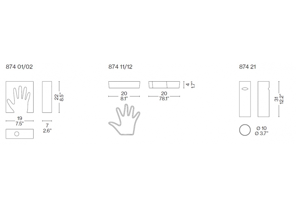 | Dimensioni | 874 01/02_ 19 x 7 x H 22 cm; 874 11/12_ 20 x 20 x H 4 cm; 874 21_ Ø 10 x H 31 cm. |