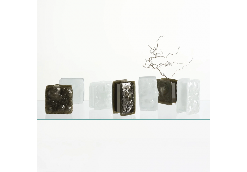 Opalia firmato da Patricia Urquiola per Glas Italia è un vaso realizzato fondendo sfridi di cristallo con speciali additivi che creano masse vetrose irregolari donando una superficie ondulata e ricca di bolle. Disponibile in diverse finiture.