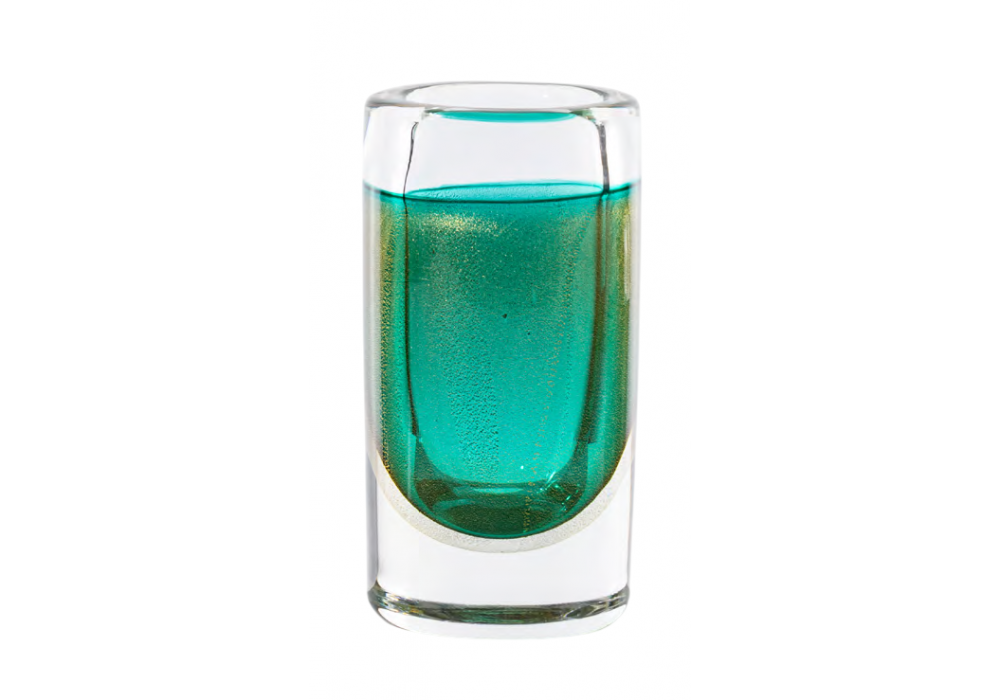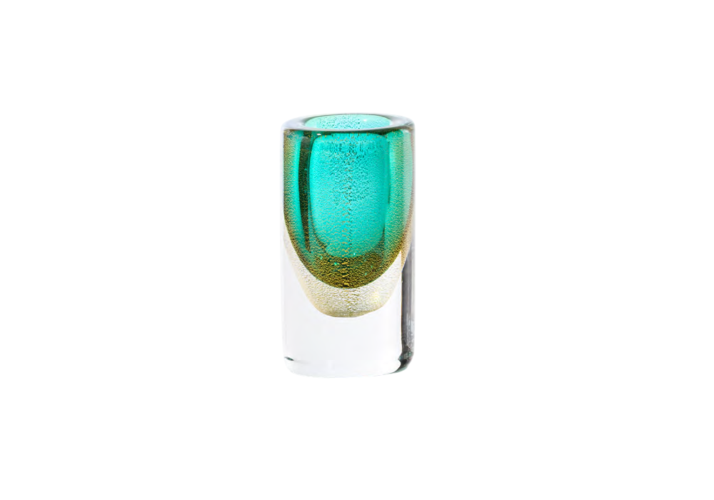 Cilindro Sommerso firmato da Peter Marino per Venini è un vaso realizzato in vetro soffiato e lavorato a mano in finitura sfumata cristallo trasparente, verde paraiba e foglia oro.
