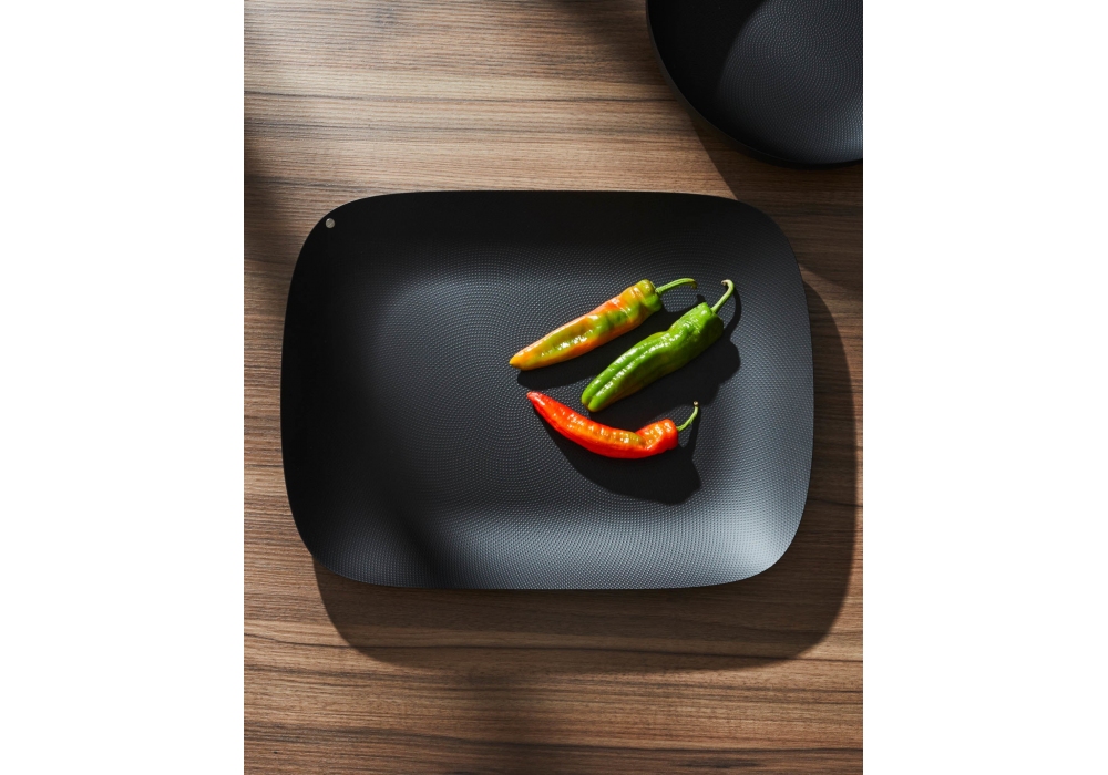 Moiré firmato da Jasper Morrison per Alessi è un vassoio rettangolare realizzato in acciaio colorato con resina epossidica e decoro a rilievo.