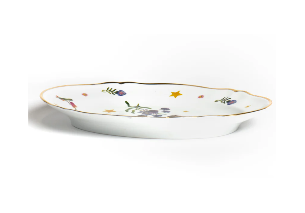 Profumo firmato da design Aitch.Ro per Bitossi Home è un vassoio ovale in porcellana con decorazioni e dettagli in oro. Adatto alla lavastoviglie e a un massimo di 250 lavaggi. Non adatto al microonde.