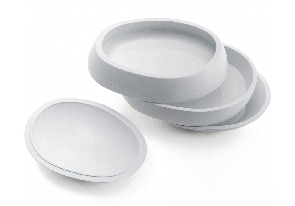 Inside firmato da Naoto Fukasawa per B&B Italia è un set di 4 vassoi ovali componibili, realizzati in resina poliuretanica ad alta densità verniciata lucida, in finitura bianca o nera.